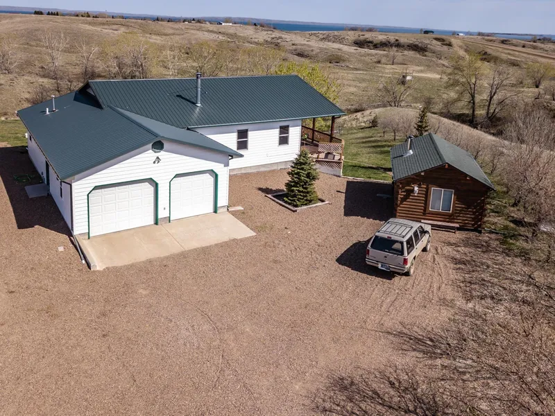 Imagine shoreline views of Fort Peck from your front deck when youre not out fishing! This is one of the few privately held properties in this area to come available for sale in the coveted Duck Creek area on a full acre. The home sits approximately 300 yards off the lake with enough elevation to see for miles. The home was completely remodeled in 2011. All the garages are insulated including the 2-car attached, 2-car detached shop and dedicated boat garage. Launch from the Duck Creek boat ramp just down the hill to fish or hunt this massive lake. The yard is landscaped and will remain private due to the coulee on the east side property line. Full RV hookups next to the boat garage and cabin style guest cottage for entertaining guest. No covenants or HOA. This home is perfect for endless friends, family and fishing.