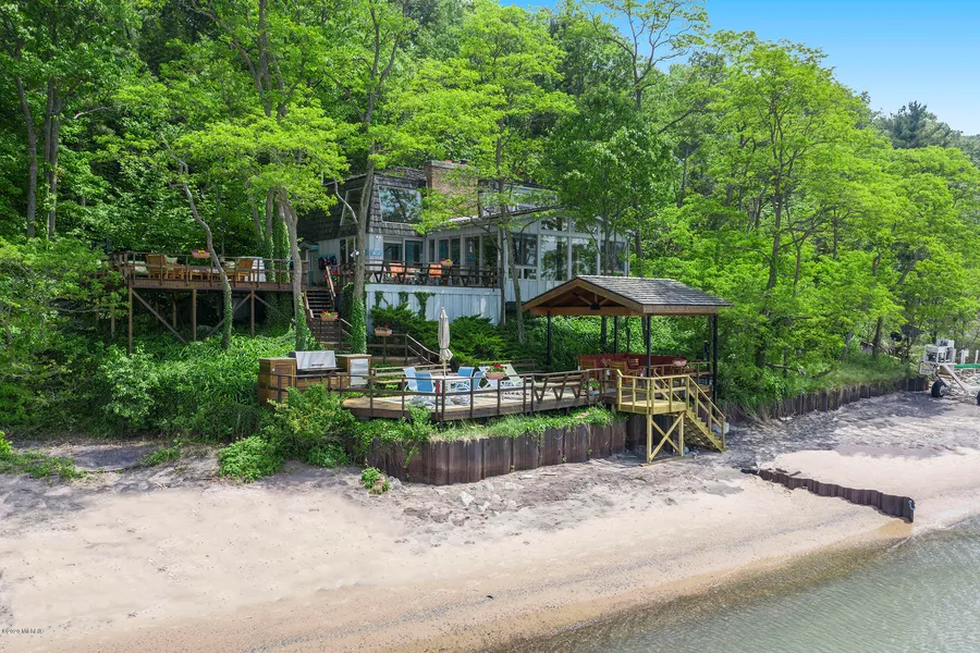 Remarkable & unique Lake Michigan family compound with 2 homes, one on the bluff & one right down on the beach with panoramic 180 degree views! Both homes have had MAJOR remodels. The guest cottage was torn down to studs in 2015 & rebuilt with great views, 3 beds and 2 baths. Main home had upper level converted into a large master suite (formerly 3 bedrooms) with large walk in closet and luxury master bath. Approximately 120 ft. of Lake Michigan frontage with a nice sandy beach. South Haven city water, 4 car heated garage & 2 outdoor heated showers. Fantastic outdoor decking including covered large outdoor living area right on the beach with fire pit, electric, & more. Could be split & sold as 2 homes. Both homes have backup generators. Covered Tram between guest house and main house.