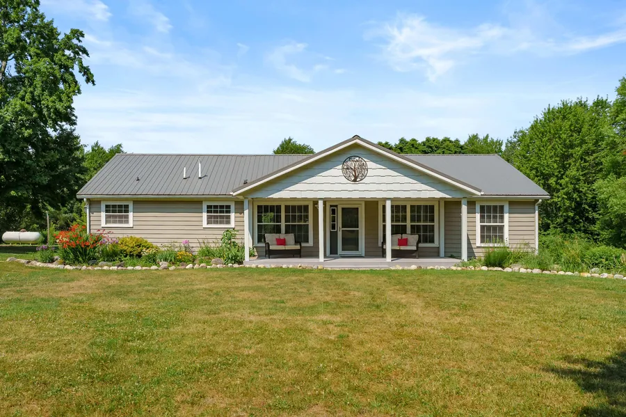 Your private retreat awaits! This one-owner ranch-style home sits on a serene 20-acre parcel, perfect for hunting and outdoor recreation with two gun shacks and trails throughout. The home features a spacious open-concept layout, an updated kitchen with beautiful KraftMaid cabinetry, luxury vinyl plank flooring, and a cozy fireplace. A 24x56 pole building includes a fully equipped 24x24 living space with 10' ceilings, full kitchen, bath, slider, and private patio, ideal for multigenerational living or guests. A second 30x30 pole building, recently crafted by the Amish, includes a second floor for added storage or workspace. Located just 5 minutes from Paw Paw Lake and the shores of Lake Michigan, this property offers the perfect blend of comfort, functionality, and outdoor adventure. All buildings, including the home, feature durable metal roofs. The main home primary suite is privately situated on one side of the home, complete with an en suite bath, while two additional bedrooms and a flex space/office with French-style glass doors are located on the opposite side, ideal for functional and flexible living. Enjoy peaceful mornings on the welcoming front porch and entertain with ease on the expansive back porch with expansive views of nature.