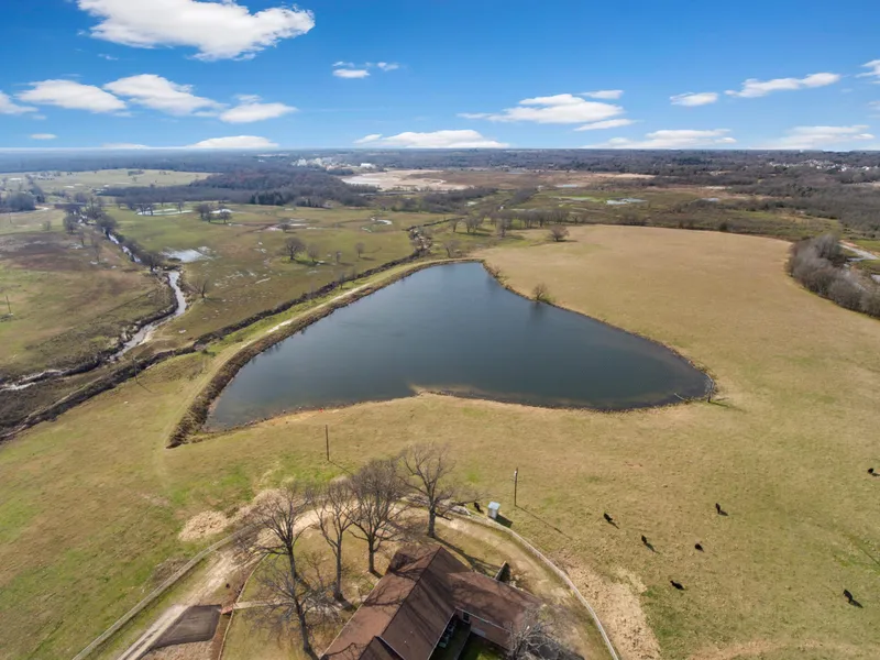 The beautiful 3752 sq. ft., 4 bedroom, 3 bath elegant ranch home features two master suites, additional office space, formal dining area, chandeliers, crown molding and wood burning fireplace. Kitchen includes a large stainless freezer and refrigerator, range, dishwasher and built-in microwave; granite countertops, pantry, and Copper farmhouse sink. Open concept with plenty of natural light and breath-taking views. The home overlooks a 7 acre lake and the beautiful acreage.