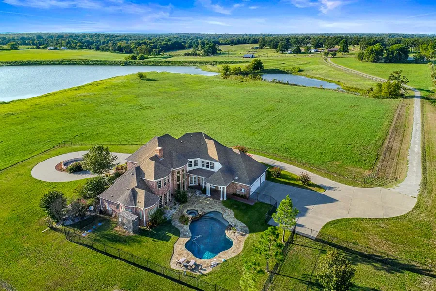 Lush almost 45 acres with part of a 15 acre stocked fishing lake, plus 1 acre pond & over 4200 sq ft Executive Home built 2005 with pool & spa. Follow a long winding drive around huge lake to circle drive & terraced landscaped entry to this custom 4 bed, 3.5 bath, 3 living home w- 3 car gar. Spectacular views abound! Living Room offers 20 ft. ceiling w- almost floor to ceiling windows, wood lam floors. Granite Kitchen w- view of pool open to Family Room. Master down w- separate study & luxury bath. 2 staircases, Game room & 3 bed and 2 bath upstairs. Covered porch overlooks pool & spa, iron fenced yard, plus animal yard w- shelter. Fenced, cross fenced, hay barn. Home available w-more acreage.