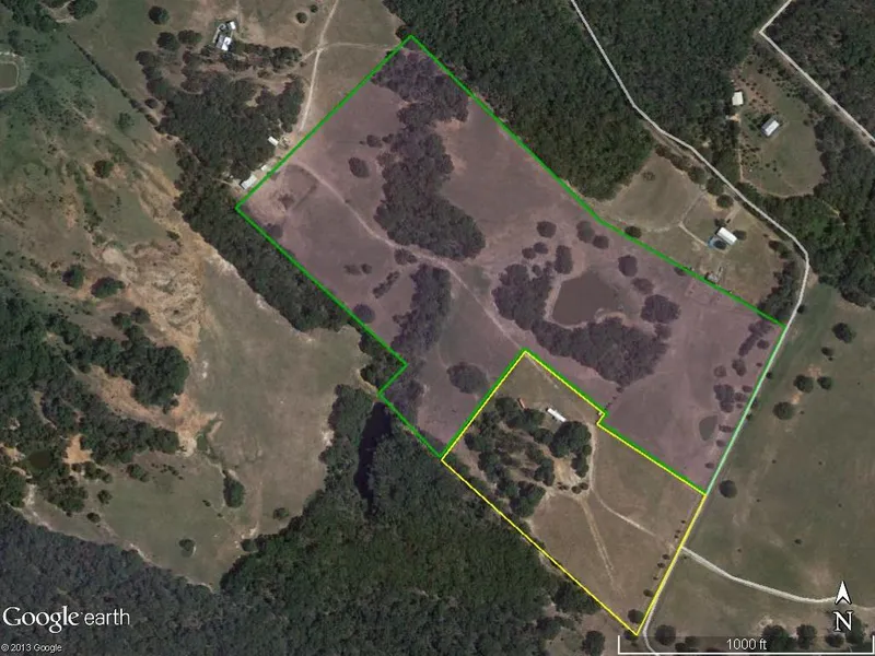 Approximately 35 acres of rolling terrain with pond, pasture land, mature trees and ravine. **12 additional acres available with single wide - see agent for details - yellow area on aerial
