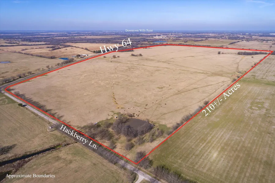 Magnificent East Texas sunsets and pastoral views of the countryside! You can see for miles from this high vantage point just south of Wills Point! 210 acres of gorgeous cattle land with three ponds! Frontage on Hwy 64 (2570 ft) and VZCR 3418 (1283 ft.) makes this a perfect parcel to develop! A thick carpet of established bermuda grass lends itself as a hay pasture or great for cattle production. Three ponds with fish! Just two minutes to the Van Zandt Regional Airport! Easy access to Interstate 20 and Hwy 80 for commuting to DFW Metroplex or Tyler! Only one hour to Dallas! The property has some restrictions including: No mobile homes, modular homes or RV's; no solar panel farms; no storage of trash, junk, rubbish, non-running vehicles. No storage of surplus building supplies or rock. No pigs or hogs. Choose the country lifestyle today - fresh air, chirping birds, and peaceful surroundin...