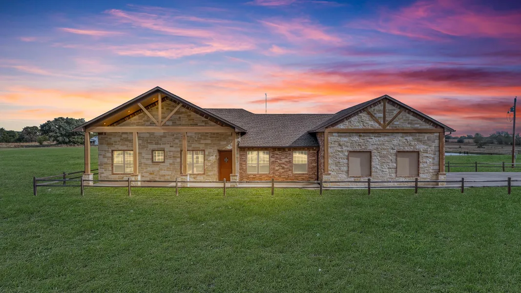 This custom built 3 bedroom 2.5 bath home on over 13 acres boasts luxurious features and beautiful finishes throughout! Ceramic tile throughout the home, crown molding, oiled bronze finishes, custom cabinetry, and granite countertops along with a state-of-the-art filtration system and hot water heaters that can be controlled by a smart phone make living here easy! The open floor plan with rock, brick, and wood accents is exquisitely enhanced by large windows, abundant natural light, and incredible countryside views. Find peace and calm in the master bath with an oversized jacuzzi tub and walk-in shower, while laundry will be pleasant in the large laundry room with separate sink. A screened-in porch, paved driveway, front porch, back patio, and surveillance cameras make living indoors and out effortless. A fully insulated shop with an equipment barn has incredible storage space, and you'll love to spend your evenings down at the stocked pond with aerating fountains and fishing pier. The 3-car garage has a 14ft ceiling on one side to house an RV, and a storm cellar under the garage floor will give you peace-of-mind. The land is fenced and cross-fenced with gorgeous level pastureland! Located just a little over an hour east of Dallas or 45 minutes west of Tyler, youll have easy access to Canton, Tyler, and Terrell. Enjoy big Texas skies, sunrises, and sunsets from this slice of heaven! Call today!