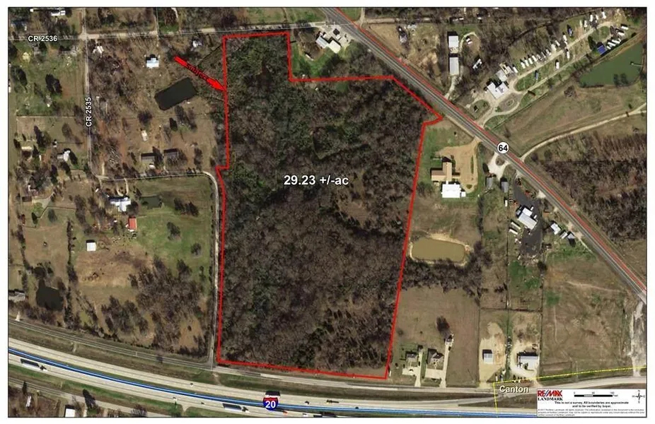 Excellent 29 acre commercial site located on I-20 frontage, just outside of Canton City limits. Property has frontage on I-20 and SH 64. Seller will consider seller financing to qualified buyer. Great site for equipment company, trucking company, manufacturing, etc. Great access to two major thoroughfares in East Texas. Seller will sub-dividing into 19 ac & 10 ac increments.