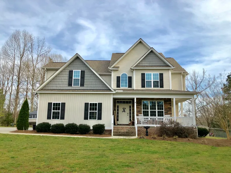A RARE FIND!! Beautiful, five-year-old TRANSITIONAL home on FOUR ACRES located 5 min. from KERR LAKE. NO deed restrictions or HOA. Large fenced area in rear. Small pond at back of property. Extended parking pad at garage. Pear & Pecan trees. Front porch, rear deck & patio w/ fire pit. Oversized finished garage. Features include 9-ft ceilings on main, double trey ceiling in master BR, sitting room off BR#3, expansive bonus room, granite countertops, under-counter lighting, tile backsplash, and MUCH MORE!!