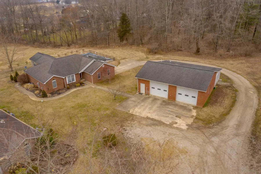 WEST- 4 acres, lake, brick ranch, HUGE detach garage. Do you have alot of toys? This is house for you then. 7 car garage including the detach and attached garage. Detach garage is heated and cooled entertains a half bath, ovesized garage doors. Brick ranch boasts approximately 2100 sq ft of living area. Large kitchen/dining area with island along with an abundance of cabinetry. Additional rooms consist of 3 bedrooms, large master with walk-in closet, living room, family room, flex room and 2.5 baths. Salt water inground pool with newer sand filter for the upcoming summer fun will be enjoyed by all. Lake with dock is well stocked for the fisherman of the family. HVAC approximately 1 year old, plus a 1 Year AHS Home Warranty included.
