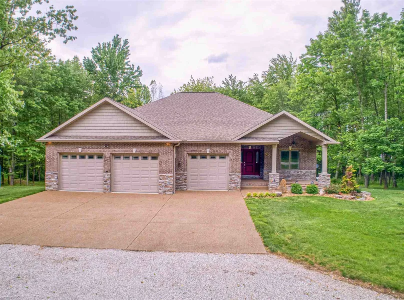 One owner, custom built home on 5.04 acres in a private, wooded setting with a shared lake. This location is within 18 minutes of Toyota and within 7 minutes of I-69, convenient but feels secluded! You'll notice the impeccable exterior details - the covered front porch, the beautiful brick and stone work, the low maintenance hardy board accents - the minute you drive up the long driveway. 3 car garage with 3 separate overhead garage doors. Full unfinished walk-out basement with poured concrete walls provides opportunities for a workshop area, a home gym, a rec room, another bedroom, etc. Lots of possibilities here! A large covered patio as well as a 16 X 12 ft. screened porch provide relaxing places to enjoy the sights and sounds of nature at its best. Trex type flooring has been used on the screened porch and a water spigot was installed as an extra convenience. Other outstanding amenities include a whole house generator, a gun range area, exterior camera system, gutter guards, tankless water heater, and a water purification system with water from the shared lake. The interior of the home has been carefully planned and well maintained. Hardwood flooring and tile throughout the main level. Open floor plan with split bedroom design. Entry foyer with wainscoting and chair rail leads into the Great Room. The Great Room has a gas log fireplace flanked by built-in bookcases and cabinetry, trey ceiling and great views of the backyard woods. The kitchen area has Amish cabinetry with raised panel end caps, Samsung stainless steel appliances, granite countertops, tile backsplash, pendant lights, and a raised breakfast bar. The open Dining Room features a simple chandelier and access to the screened porch. The main en-suite offers a trey ceiling, ceiling fan, double sink vanity walk- in tiled shower, heated tile floors, and soaking tub is the perfect place to start or end your day. Two other bedrooms with another full bath are located on the other side of the house. The seller carefully planned this home with extra details throughout the home. You will be impressed! Acreage, shared lake, basement, convenient location, and beautiful home all wrapped up together in this property . . . WOW!