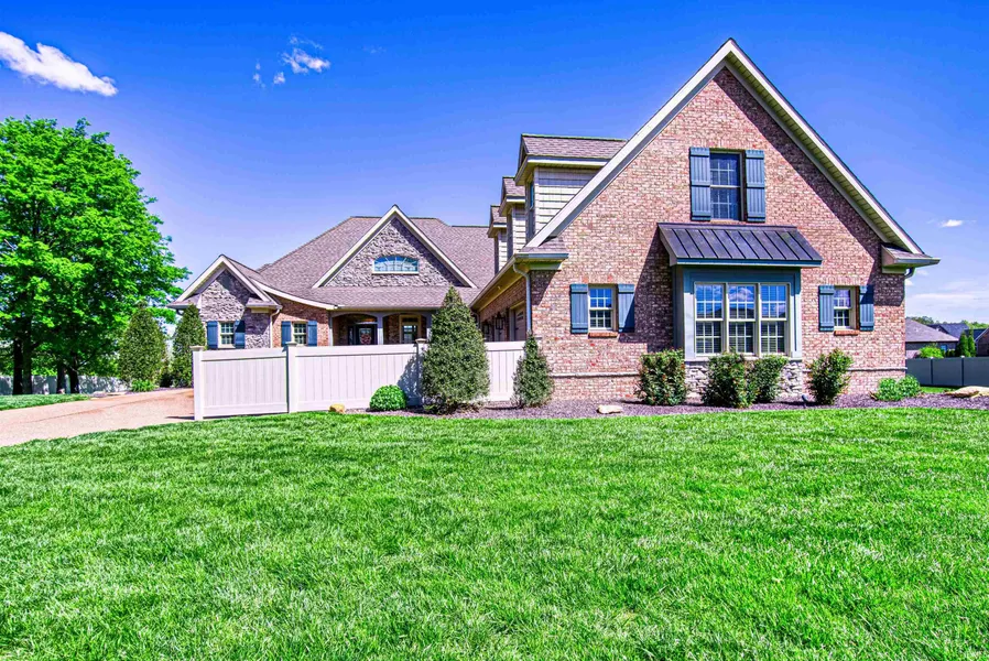This custom built home is located in Cambridge Golf Course Community and is loaded with upgraded amenities & gorgeous lake views. The home offers an entrance with brick accents, gorgeous landscaping, and is situated on a large corner .98+/- acre lot. The spacious foyer of this home with extensive woodwork throughout opens to the dining room with inlaid granite flooring. The impressive great room with marble surround fireplace offers hardwood flooring and a wall of windows providing natural light and great views. The kitchen with an abundance of custom cabinetry, top of the line appliances including gas range, granite countertops, breakfast bar, large island, pantry, prep sink, and spacious dining area has access to the covered porch. The main level den with coffered ceiling & fireplace is the perfect place to relax. The home office was designed to be utilized as an additional main level bedroom with walk-in closet and access to a full bath. The owners' suite is a true retreat with fireplace and private access to the porch for morning coffee. The ensuite bath features separate vanities, custom tiled shower with dual heads, and a 13x18 walk-in closet with built-ins. There is a guest bath and large laundry with cabinetry and sink completing the main level. The second level is perfect for guests or teens with a bedroom, full bath, and a bonus area in addition to walk-in storage area. The quality finished walk-out lower level offers two additional bedrooms with Jack & Jill bath and was designed for family enjoyment with a family room with stone wall with fireplace, projection system, and a custom bar with additional kitchen. The lower level also offers a wine room, exercise room, and guest bath. There is an oversized 3 car garage in addition to the 16x36 golf cart/workshop area with overhead door, cabinets, and sink. This impressive home is located in a community offering inground pool, tennis courts, & more!
