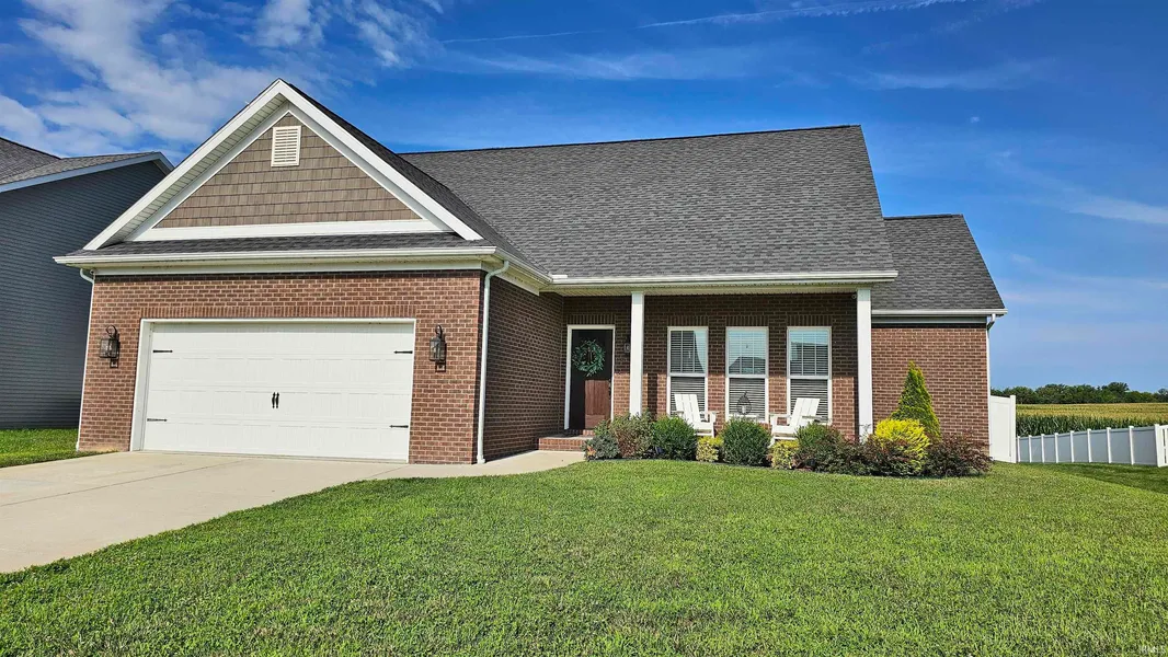 Welcome to your McCutchanville sanctuary! This stunning 2020 build home offers the perfect blend of luxury and charm. Step inside to discover the impeccable craftsmanship providing an open, split-bedroom, concept with 9ft ceilings, giving you a spacious and airy feel. The craftsman solid pine baseboards and custom-built fireplace with built-ins add warmth and beauty to the main living space.The kitchen is a true highlight, boasting upgraded Amish-built 6ft island (complete with a convenient cookbook shelf), solid wood cabinet fronts, upgraded appliances (including a double convection oven, low-profile microwave, & full-stainless interior dishwasher) and quartz countertops that add both elegance and functionality. Adding to the allure are the engineered hardwoods throughout, creating a seamless flow from room to room. The primary suite to the left of the main space is generously sized wit...