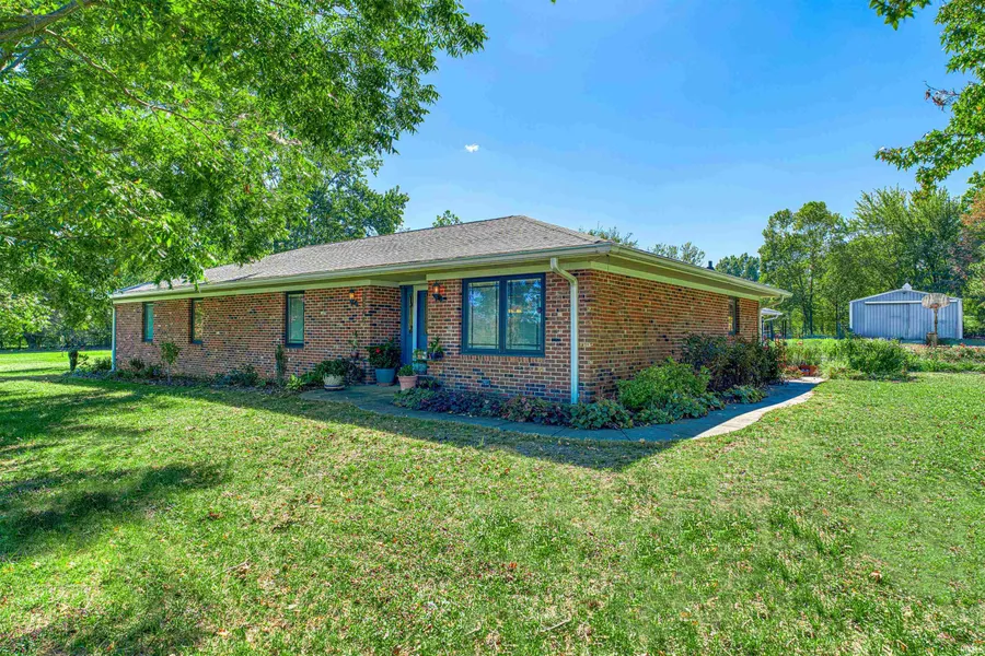 This rare find on the northwest side of Evansville offers over 2,900 sqft of living space, nestled on 2.12 +/- acres of land. The property includes a 64x24 pole barn with concrete flooring, featuring horse stalls, a tack room, and a large workshop area‹”perfect for horse enthusiasts or hobbyists. The home boasts four spacious bedrooms and four full bathrooms. The heart of the home is the expansive great room, complete with a copper-topped fireplace, built-in shelving, and a wet bar with seating perfect for entertaining. Conveniently located off the recently renovated kitchen and spacious dining area, the great room provides the ideal flow for gatherings. The kitchen offers updated cabinetry, solid surface countertops with a large peninsula, and modern appliances, including a gas range, and microwave with convection and air fry options and is open to the living room. The updated laundry room with pantry features new flooring, shelving, and a laundry sink, providing plenty of storage space and convenience. The primary bedroom offers an ensuite bath, large vanity, and an updated Pearl jetted tub. This wing of the home includes three additional bedrooms and two full bathrooms, offering ample space for family or guests. An attached 23x25 garage with a separate 25x8 storage area adds even more functionality to this property. With the expansive outdoor space, there's endless potential for creating a horse property or enjoying country living. Recent updates (per seller) include a new carpet, fresh paint throughout, Navien boiler heating system, 50-year roof with transferrable warranty, back patio, Pella windows, and water heater, among other improvements.