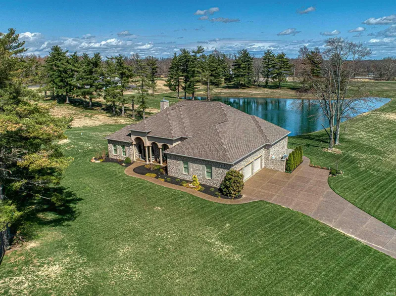 Have you ever dreamed of having your own piece of paradise? You might discover it right here! This charming, one-owner home boasts three bedrooms and two and a half bathrooms, situated on Evansville's northside and offering everything you could desire! Designed and constructed by Hirsch Homes in 2018, this exceptional property offers over 3,000 square feet of living space, set on 2.5 acres of land, with breathtaking lake views visible from nearly every room. As you step into the foyer you'll notice the soaring ceilings, elegant crown molding, and arched details that greet you. To the right, the formal dining room features columns and arched windows, while directly across the foyer, the den boasts a custom-built entertainment center. The foyer effortlessly transitions into the living room, where you'll find a high coffered ceiling, a cozy gas fireplace, built-in cabinetry, and breathtaking lake views. The gourmet kitchen boasts an expansive island with bar seating, complemented by top-of-the-line appliances and a cozy casual dining area. The expansive owner suite showcases a double tray ceiling, a comfortable sitting area, private access to the screened porch, dual walk-in closets, and a stunning en suite bathroom, creating a luxurious retreat. The split bedroom floor plan positions the two additional rooms on the opposite side of the home and sharing a well-appointed hall bath. Revel in the tranquil lake ambiance from the screened porch or the free-standing patio area near the water, complete with a dock for easy access to additional water activities. The three-car attached garage is equipped with heated epoxy flooring and a built-in vacuum system, offering both comfort and convenience. This meticulously maintained home boasts a plethora of features that cater to comfort and functionality??don't miss the opportunity to make it yours today!