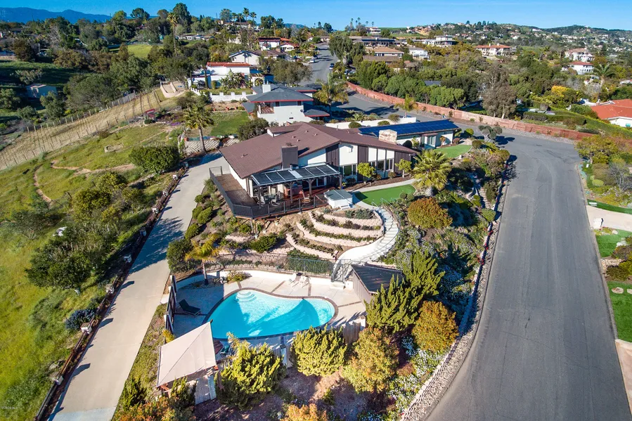 When view & privacy are paramount, you've found it in this single level, extensively remodeled Las Posas Estates home. Perched atop a cul-de-sac on terraced lot taking advantage of city, ocean, island, & mountain views with ever-changing sunsets over Pacific, brilliant light shows at night & a front row seat for Camarillo air show! As you enter you're greeted by the views beyond the formal living & dining areas with terrazzo floors and marble fireplace. There are 2 bedrooms in the south wing, with own baths, separate laundry room & a luxurious master suite with a spa-like master bath, huge custom closets & over the top views. The north wing features a beautiful island kitchen, Stainless appliances, custom cabinetry, stone counters & woodlike floor extending into great room with stone fireplace & expansive views thru wall of glass opening to outdoor entertaining area. The upper deck & terrace feature a built-in BBQ, putting green & spa overlooking the city and ocean. Down the terraced trail is a heated pool with its own entertaining & sunbathing area visible only from the home. A 2 car garage at the end of long driveway is hidden from street with extra off street parking. Garage has direct access to home & interior stairwell leading to 4th bedroom/office.