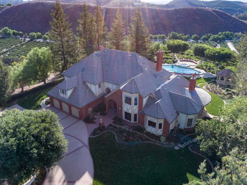 What a spectacular setting for this 6,145 sqft Estate home on 20.15 acres and with over 2000 producing lemon trees! The views are simple Amazing. Located in gated community of Solano Verde in the hills of Somis. Features 4 bedrooms, each with their own bath, a office space and a huge game room. The large master suite has a large changing room plus his/her walk in closets with a view of the surrounding mountains. The large gourmet kitchen features granite counters and stainless steel appliances. Custom beveled and leaded glass windows throughout makes for lots of natural lighting. Spectacular grounds with pool/spa, private tennis court and lots of large tees. There is also, a 4 stall barn and tact rm with possible living quarters, space for an arena below. Must see! Too much to mention