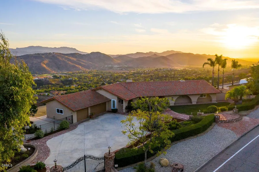 On a Clear Day You Can See Forever from one of the most breathtaking estates in Santa Rosa Valley with elevated sweeping panoramic views all the way to the Channel Islands. Located high atop Santa Rosa Valley's uppermost ridge, this secluded ultra-private gated estate provides custom details everywhere including vaulted beam ceilings, custom woodwork and travertine flooring. This remodeled home evokes classic Santa Barbara with the ease of single level living providing 3 ample sized bedrooms plus an office, elegant in design, ideal for formal entertaining and comfortable family living. Just off the gourmet kitchen is a set of doors that open out onto a dining and lounging terrace with cross-canyon views. The whole house unfolds to the views and the outdoor living spaces. Primary bedroom suite with luxurious remodeled bath and large walk-in closet. The office has elegant wood panel walls, built in bookcases and views. An outdoor patio area with fountain and fireplace lends itself to a relaxing, ultra private spa like experience. Property is approx. 5 acres, with plenty of southern exposure space that is ready for a private orchard or vineyard. A beautifully finished three car garage with cabinets and epoxy floors, additional RV parking and a large area adjacent to a rear private driveway has been used in the past for horses where a tackroom /shed currently exists and is ideal for a multitude of other uses.