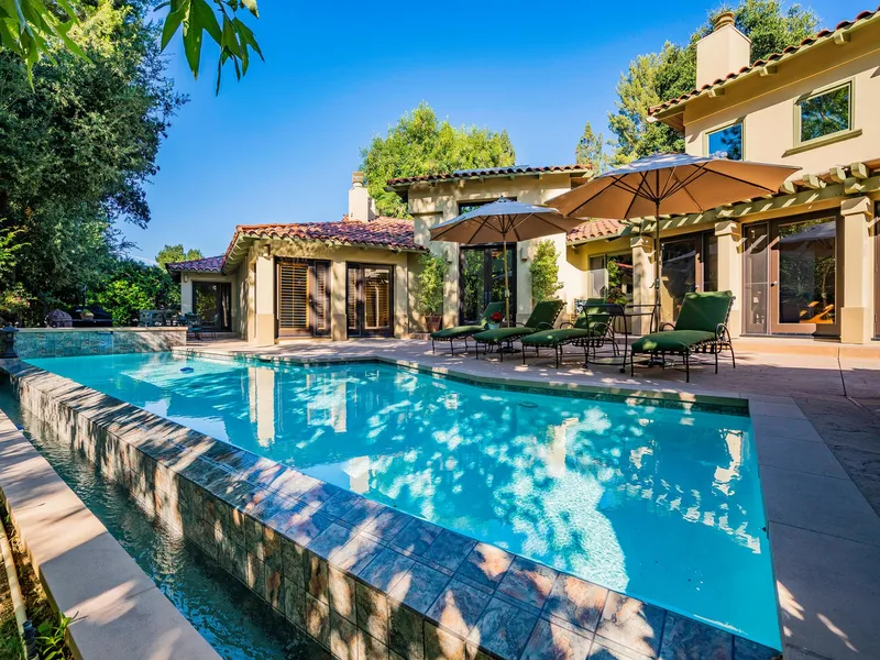 Welcome to privacy and serenity situated on 1.59 acres of natural beauty. This one-story Mediterranean estate captures the essence of Bell Canyon. The enclosed courtyard invites you to the infinity pool & clear glass double doors. The two-story entry is inviting with slate flooring. The living room features a wood-beamed ceiling & rock fireplace. The office/study is situated with a bath and double French doors which lead to the private hall & bedrooms. The large bedrooms are next to the master suite. The spacious master retreat features a gym, walk-in closets, beautiful bath, fireplace, wood-beamed ceilings, bar & direct access to the pool/spa. The dining room is close to the kitchenconvenient for entertaining. The gourmet kitchen has a stainless-steel commercial stove with grill and griddle, double ovens, two sinks, bar, built-in wine refrigerator, glass cabinets & a rock fireplace. Off...