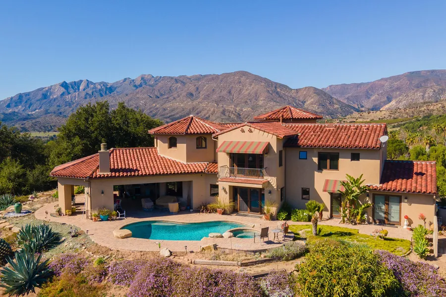 This Marc Whitman design sits on two separate lots equals approximately 7.27 acres with fantastic views and offers upscale country living minutes from the cafes, shops, galleries, and farmers market in downtown Ojai. The first- and second-floor master suites allow you to choose which will be your private retreat and which will provide a comfortable stay for guests.Third floor is office could be converted to 3rd bedroom. the kitchen, cooks will love the Wolf range, warming drawer, over-sized island with breakfast bar, walk-in pantry, butler's pantry, built-in desk, and beautiful views of the pool, valley, and mountains. Other interior features include vaulted ceilings, four fireplaces, jetted soaking tub, large closets, and versatile spaces. Outside, a gorgeous outdoor living area offers a pool, outdoor kitchen, and patio fireplace. There is also a separate garden area, Solar for the house and property, RV parking, or horse facilities, as well as an avocado orchard, two-car carport, family orchard and beautiful mountain and valley views.
