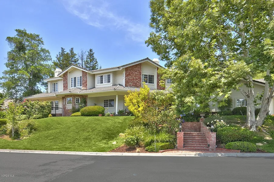 6 Bedrooms + Santa Rosa Valley Pool Home Traditional Nantucket New England Estate replete with majestic columns, elegantly situated as a crown jewel on a curved lot on over an acre.The main house features 5 bedrooms and 4 baths upstairs and an additional large bedroom with its own full bath downstairs which could be in-law quarters or media room. This estate supremely merges classic architecture with contemporary design. Separate attached guest house complete w/kitchen, living area, bedroom, bath, laundry & private entrance. The open floor plan seamlessly blends indoor and outdoor living, with each room allowing guests to capture breathtaking views.With all of its scale and grandeur, the home remains warm, and inviting,making it a unique retreat for intimate family life yet poised for large-scale entertaining. This home has a traditional floor plan with center entrance hall, gleaming wood flooring, gracious living room, formal dining room with fireplace, family room with floor to ceiling brick fireplace, and piano music/game room directly off the family room. Gourmet chefs kitchen & 2 walk in pantries, granite counters, and warming drawer. Lavish master suite features balcony, two fireplaces, remodeled lavish Master Bath with dual marble vanities, huge walk-in closet. The huge rear yard features resort style pool and waterfall, ideal for entertaining & large raised deck covered patios create a rambling wonderment of elegant living. Driveway with electronic closing gate.