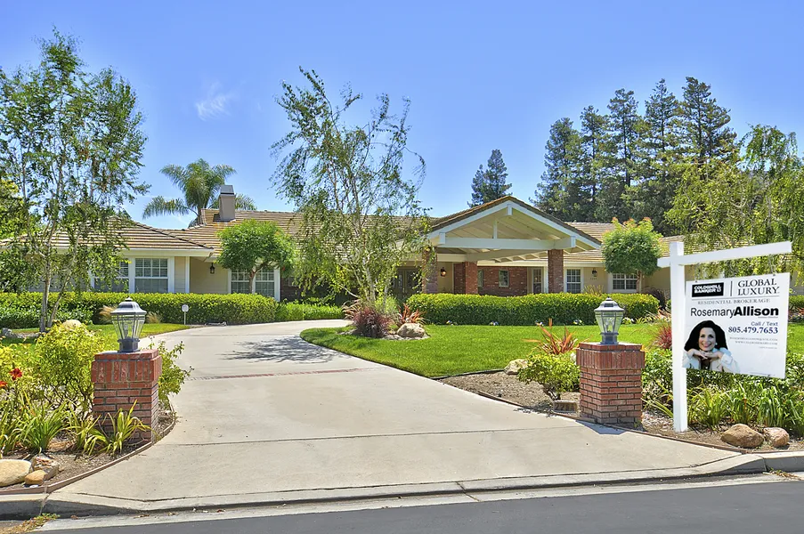 Conceived of the drama & the romance of an exquisite New England Country Estate, this sought after one-story home is located on over an acre in the exclusive Wildwood Ranch neighborhood of Santa Rosa Valley. Circular drive features Porte-cochere entry. Distinguished architectural bearing & the use of enduring wide plank thick Hickory flooring. Remodeled gourmet kitchen with upper tier stainless appliances including double oven, built-in microwave, Built-in refrigerator and 6 burner range, Granite kitchen counters. 4 Fireplaces, one in primary suite, family room, living room and rear yard. Large formal dining room. Indoor laundry. The primary bedroom suite indulges the owner with a sitting area, huge walk in closet, fireplace and luxurious remodeled bath, with sunken whirlpool tub, and separate shower. There are 5 bedrooms (or 4 bedrooms and office) and four full baths plus a powder room....