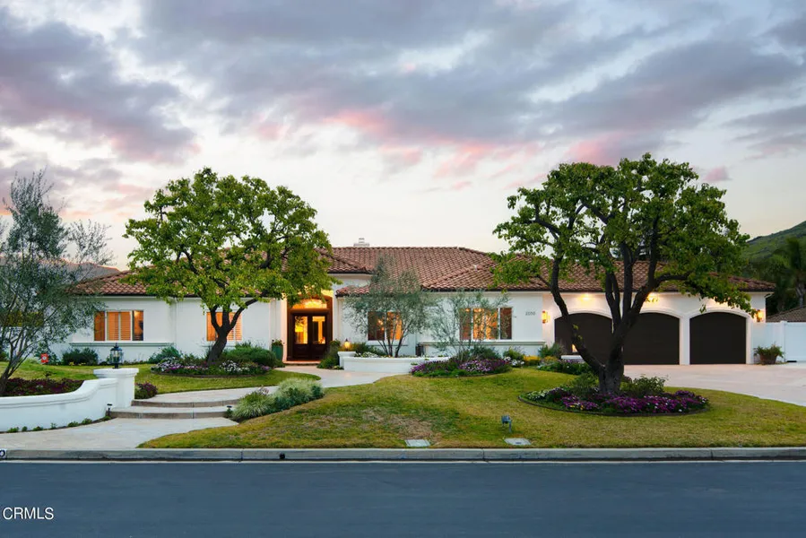 Conceived of the drama & the romance of a Santa Barbara style estate, this sprawling single level home is located on over 1 acre in Camelot gated neighborhood of Santa Rosa Valley. Comprised of 5 spacious bedrooms, all adjacent to full & upgraded baths, plus a powder bath & a dedicated office or media room.Distinguished architectural bearing & the use of enduring wide plank Italian tile plank flooring throughout most of the rooms provides timeless elegance and style.Remodeled gourmet island kitchen w/newer Subzero refrigerator/freezer, instant hot water & filtered water dispenser,stainless appliances,quartz kitchen counters & backsplash; walk-in pantry w/custom pantry doors & farmhouse sink w/new fixtures. Large welcoming family room off kitchen area has volume ceilings, fireplace,& built-in cabinetry. Fireplaces in family room, primary suite, & living room. This architectural masterpiec...