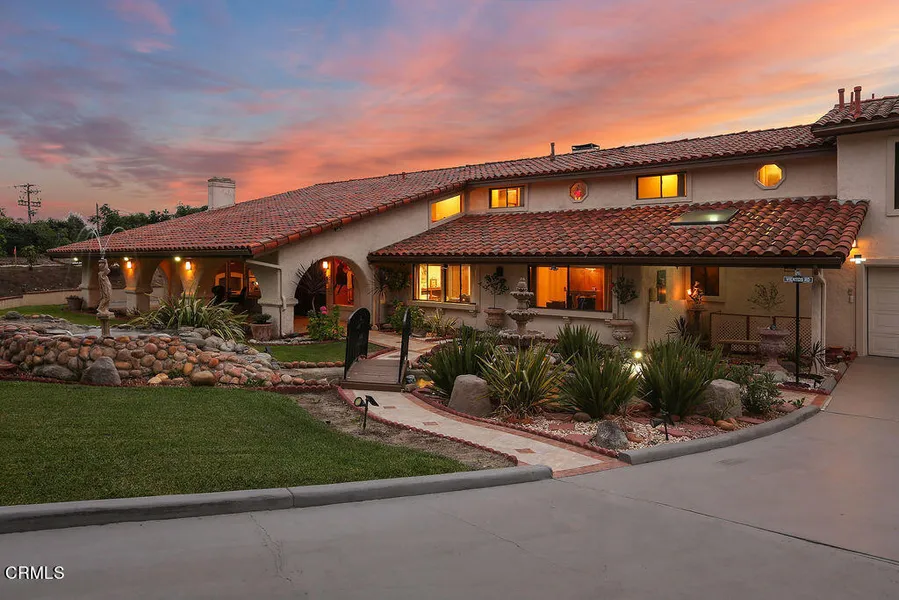This spacious custom residence built by Alan Schaub, in the highly desirable Las Posas Estates neighborhood offers an abundance of quality features and aspects that truly make this property one of a kind. Complete privacy on over 1 acre lot, fully fenced. Ample parking with extra curbed spaces for additional vehicles on driveway. Automatic front iron gate with keypad. Extensive living room formerly used as a ballroom with a step-up area for space for a live band. Upstairs Master bedroom suite with huge walk-in closet and luxurious bathroom with ornate soaking tub and custom shower with multiple heads and steam. There are three additional secondary bedrooms upstairs and two more full baths. There is a bedroom on the main floor adjacent to a full bath. Boasting expansive living spaces, dramatic ceiling heights, intricate detailing, distinctive fireplaces and the finest finishes at every turn you will find this property checks all the must have boxes. There is a dedicated office, formal dining room, family room with walk-in wet bar, eat-in kitchen dining area. Upstairs there is an attached separate guest quarters upstairs with a separate entrance, full bathroom, fireplace in living room, bedroom and second built in bar. All upstairs rooms have sliding doors leading out to the beautiful wraparound second story wide patio. There is a variety of fruit trees (apples, orange, loquat, lemons, guava, avocado). Swimming Pool with automatic cover connected to solar panels to provide use throughout the year. A professional tennis or pickle ball court with solar lights for nighttime games with friends and family. Practice wall located next to the tennis/pickle ball court. Built-in barbecue, kitchen, and covered areas for outdoor dining and entertainment. Gleaming hardwood flooring, built in central vacuum, zoned HVAC systems. Alarm system. Indoor laundry.
