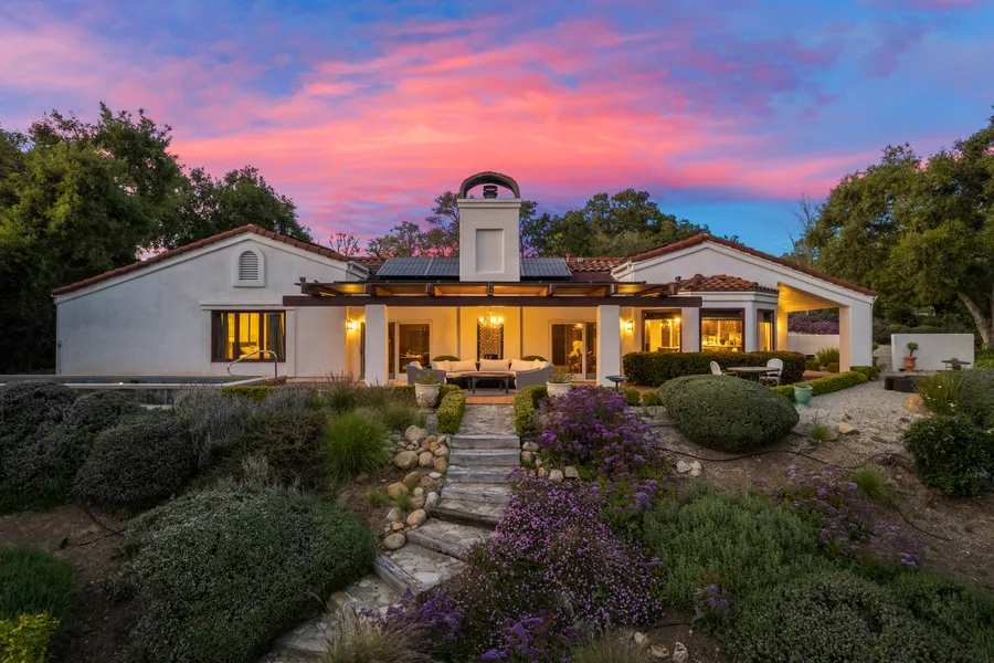An incredible view property with a classic Mediterranean single-story home, nestled within the scenic beauty of Saddle Mountain, offers a tranquil oasis that combines elegance with modern comfort. Recently enhanced with the addition of a beautiful pool & spa and an eco-friendly solar system to further enhance the simple lifestyle of Ojai living. The home radiates warmth and character from the eat-in kitchen with center island to the focal point fireplace of the great room. The primary bedroom offers a peaceful retreat with a spa-like bathroom and expansive views. Two other bedrooms flank the media room offering a seamless definition between public and private wings of the home. Some of the finishes like RTK tiles, hammered copper sinks, and European hardware help enhance the charm of the home while staying in theme with the architectural style. The property spans over 2 bucolic acres, providing a serene backdrop to the expansive patios and covered pergola. The landscaping highlights drought tolerant plantings and low maintenance shrubs with meandering paths that take one to the creek and trails. Additionally there is a detached two-car garage ideal as a workshop or could possibly be convert to an ADU.With so much to offer this special property delivers the pinnacle of the refined Ojai Valley lifestyle.