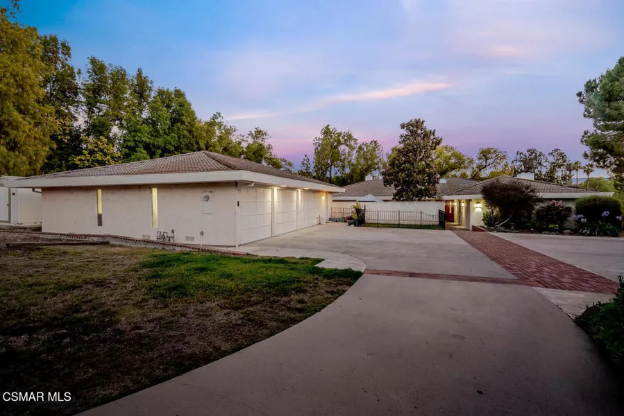 Single-Story Mid-Century Modern Lake View Home with detached ADU/Guest House on One Acre - Horse Zoned! Welcome to this rare, single-story home with 2,544 sqft of living space, situated on almost a completely flat acre on Sinaloa Lake, offering full lake membership, lake views, and direct trail access. Horse-zoned and ideal for those seeking space, the property includes ample parking for RVs, boats, off-road vehicles and guests. The main home features three bedrooms and two and a half bathrooms, with natural light flowing through large windows. Saltillo tile floors extend through the family room with built-ins and adobe style fireplace with limestone hearth. The spacious, west-facing kitchen overlooks Sinaloa Lake. The kitchen is outfitted with cherry wood cabinets, granite countertops, a center island, Sub-Zero refrigerator, stainless steel appliances, and a skylight with auto-opener. A separate living room includes a fireplace with limestone hearth and French doors leading to a private courtyard. The primary suite offers built-in cabinetry, a marble fireplace, custom lighting, and access to a private courtyard. The fully renovated primary bath features a Japanese soaking tub, dual vanities, and a large custom-tiled walk-in shower. Two additional guest rooms are located on the opposite wing, along with a full guest bathroom with a dual vanity and pocket door to the toilet area. The detached 750 sq ft ADU includes its own HVAC and features a full kitchen with cherry cabinets and granite countertops, a spacious family and dining area, bedroom, bathroom with shower, and laundry. High ceilings and luxury vinyl flooring complete the unit, which also has its own private garden. Outside, enjoy multiple outdoor seating areas to take in the sunsets, raised patio with lake views, and access to private trails. Mature fruit trees- orange and pear- are located throughout the property. An oversized three-car garage includes space for your classic car collection, a large workshop, half bath and extra storage. This is a one-of-a-kind opportunity in Simi Valley--private, spacious, and designed for both daily living and entertaining.