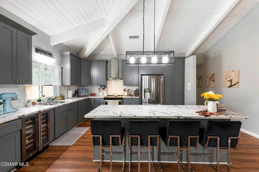 Welcome to this gorgeous single story pool home beautifully remodeled just three years ago. As a former model for the builder in this tract, this home offers a unique open floor plan with high ceilings and plenty of natural light through its new double pane sliding doors and windows. Enjoy the Chef's kitchen with self-closing cabinetry, quartz counter tops and a beautiful oversized island with seating space. This open floor plan with vaulted ceilings it's perfect for family gatherings with a large living room and dining room areas. The large Master bedroom offers a nice view of the pool area plus an spacious walk-in closet. The main bathroom has modern tile and a elegant sink vanity with self-closing drawers. The two extra bedrooms are spacious, with a mirror closet doors and a one with a new barn door. The remodeled guest bathroom has a new tub and a modern vanity. You will love the outdoors with a refreshing pool with jacuzzi plus plenty of space for a family bbq. This low maintenance home, it's perfect for family gatherings and ready for Holiday cheer. Great location, just a hop and skip away from Starbucks, shopping, church, and top local High School! You don't want to miss the opportunity to relocate to one of the safest cities in California, with easy commute to the San Fernando Valley, Conejo Valley and Los Angeles area. Gorgeous and move-in ready!Priced to sell!
