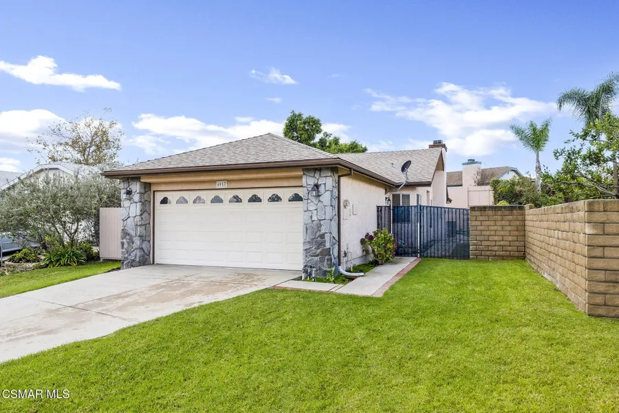 Set on a hilltop cul-de-sac, this single-story Varsity Park Patio Home welcomes you with a lush front lawn, stone-accented garage, and a brick-lined walkway leading to a gated courtyard entry. Inside, wood-like laminate flooring flows seamlessly throughout, creating a unified backdrop for the home's light and open layout. The living room features vaulted ceilings, solar tubes, and a tile-accented fireplace, with a slider offering views of the courtyard. Just off the living room, the dining area includes a pass-through to the kitchen, making everyday meals and entertaining convenient. The galley-style kitchen includes dark cabinetry, Formica countertops, an etched-glass window, black appliances, and a breakfast nook with a slider that opens to the backyard. In the primary suite, two closets, including a walk-in with built-in cabinetry--provide ample storage. A slider opens to a patio area, extending the space for quiet mornings or relaxed evenings. The en-suite bathroom features a dual-sink vanity and an oversized walk-in shower. The hall bathroom includes an updated vanity, modern lighting, and a reglazed tub/shower combination. Both bathrooms offer newer dual shower heads with handheld options. Two secondary bedrooms include ceiling fans and closet storage, with one offering access to the patio area. A linen cabinet and hall closet add additional storage in the hallway. An indoor laundry area with storage cabinetry and a newer LG washer and dryer adds daily convenience. Other improvements include paid solar, a newer water heater, furnace, AC compressor, and a newer garage door opener. The backyard features a lawn area and an in-ground spa, creating a flexible outdoor space to enjoy. Offering single-story comfort, useful updates, and convenient access to nearby amenities, this home stands out as a great Moorpark opportunity.