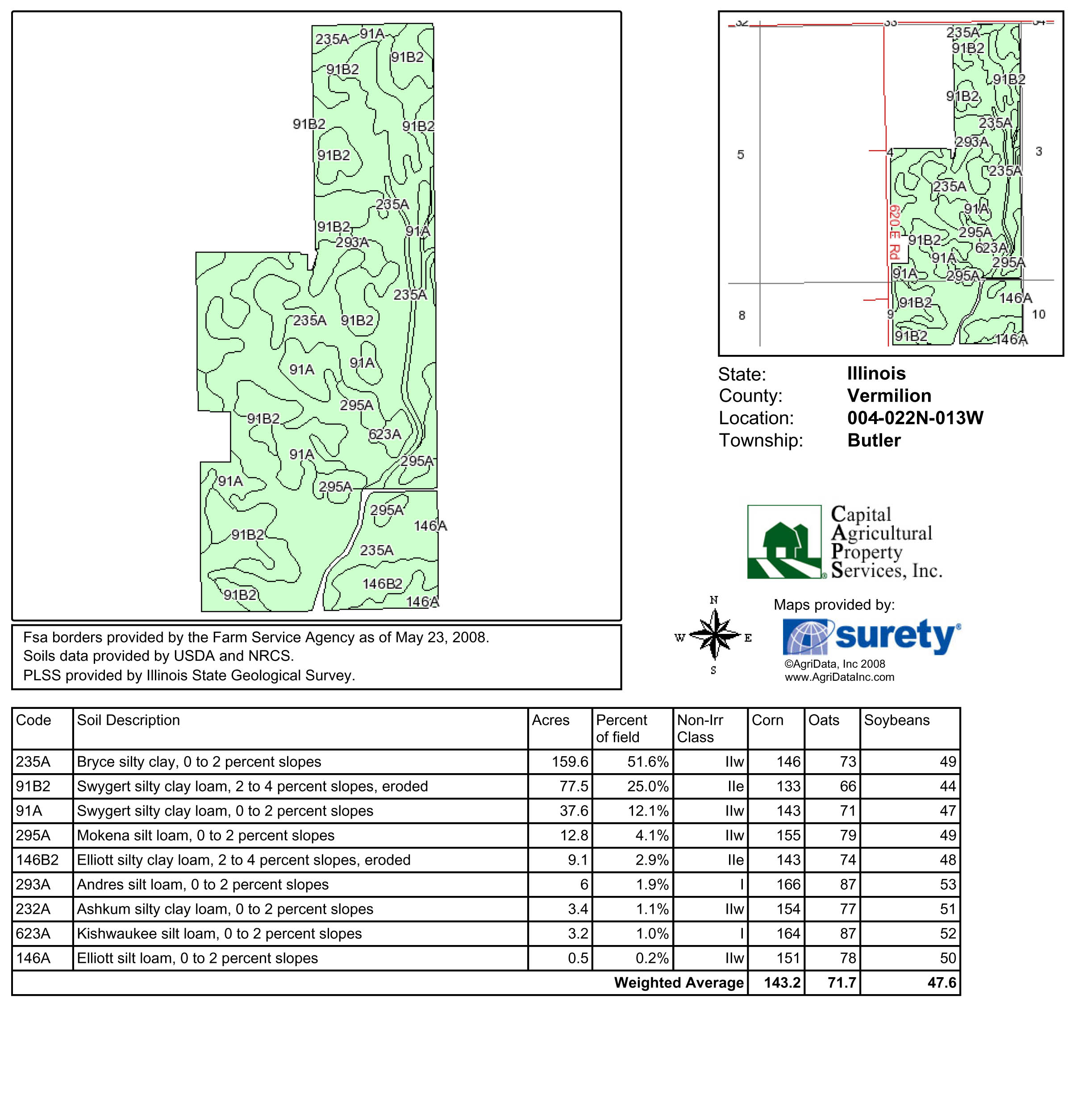 316.59± total acres, 308.4± FSA effective cropland acres, 1.3± CRP acres, 4.67± acres grass waterway. Improvements include one grain bin approximately 14,500 bu. capacity; small soybean bin; older corn crib.