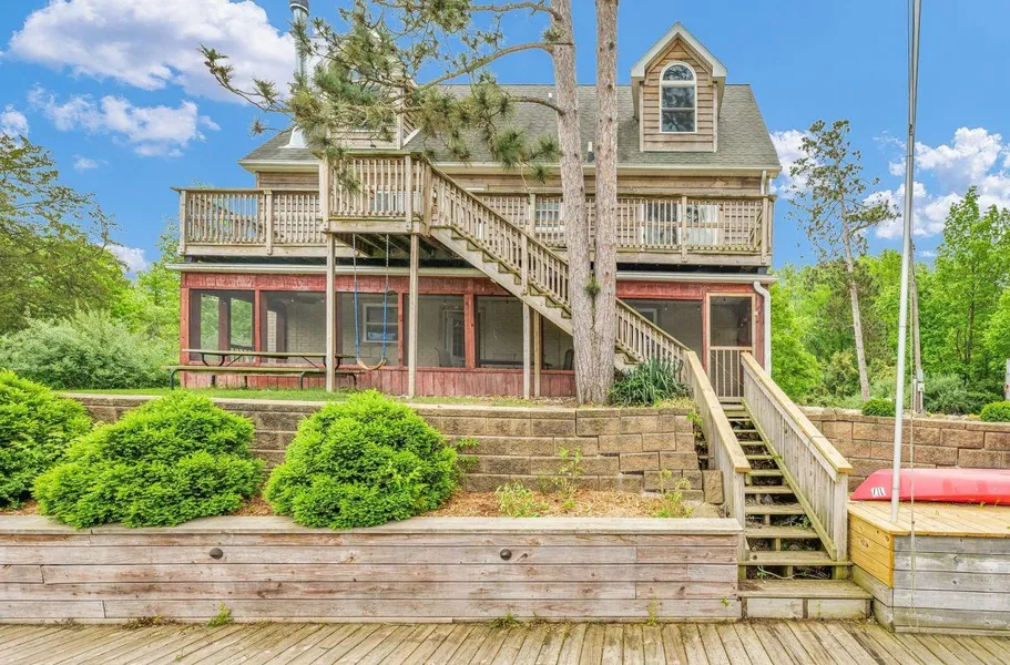 Look no further for your little piece of heaven. This home is surrounded by water on three sides and is serene and peaceful. Living room with stone, woodburning fireplace open to dining and kitchen. Kitchen has cherry cabinets, stainless appliances, Corian counters with island. Primary bedroom on main (2nd) level with walk in shower and walk in closet. Additional full bathroom on main level as well. 2 bedrooms and 3rd full bathroom on upper level. The current owners say they have loved sitting on the large deck watching the hummingbirds, swans and occasional bald eagle and those amazing sunsets. Screened porch off garage is nice for when you want to eat outside but not be bothered by bugs. There is 75 feet of extended dock and includes a 16x8 swim platform. The house is all electric with heat pump and will come with a whole house generator. This home was built for year round living but could make a wonderful lake get away also. 1200 sq ft garage is heated. Cedar siding has weather resistant spray with 25 year warranty. The lake is stocked and monitored so it's great for fishing. Boats and pontoons allowed with a motor up to 25hp. You can also deer hunt if a resident. Purchasing takes special financing as you will own a certificate as a shareholder of the corporation. You maintain your .5 acre lot. Home has been pre-inspected