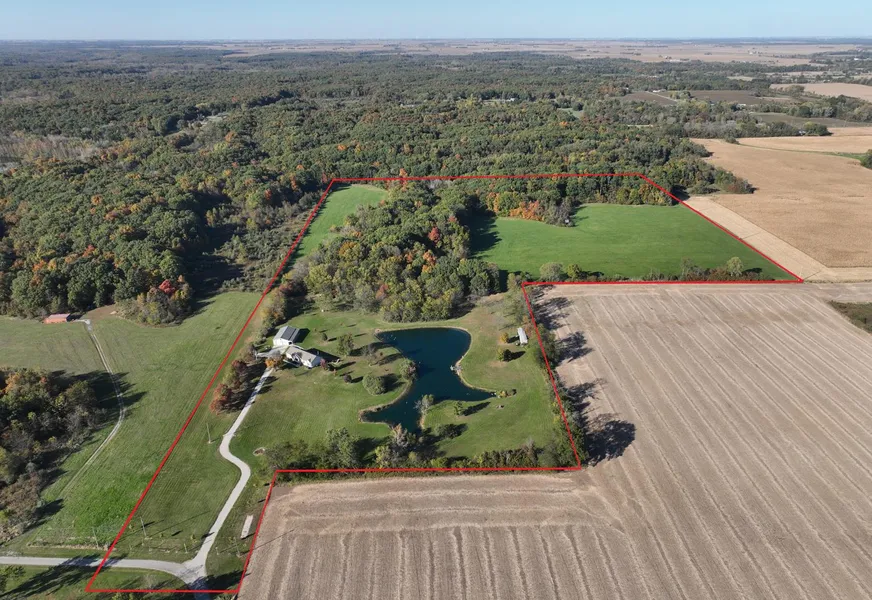 The property features +/- 18 tillable acres currently planted in alfalfa, +/- 23 wooded acres of mature hardwoods, and a 1.5 acre stocked pond with dock.