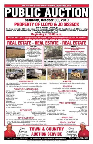 Tract #1: 1974 double wide mobile home: three bedrooms, one and a half bathrooms, eat-in kitchen with built-ins, large living room. Sells with Warm Morning heat stove and window air conditioner. Located on one acre m/l, on a tree sjaded raised lot. Home is in liveable condition but does need some repair. Home, among other items will be auctioned off on Saturday October 30, 2010 at 10:00 a.m. at listed address.