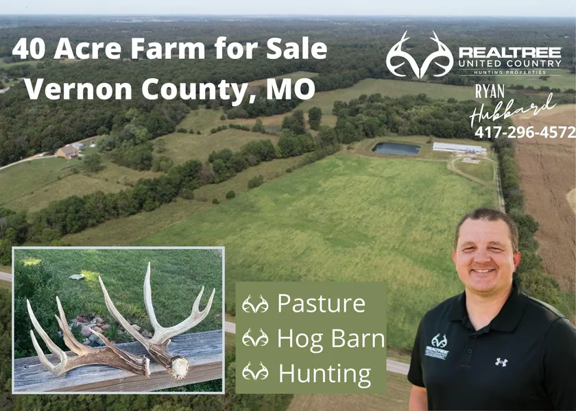 Land, Hog Barn, and Hunting: For sale is this solid 40-acre pasture tract located in eastern Vernon County, Missouri with frontage along E Hwy. This property is mostly open and is fenced/cross-fenced for cattle rotation. For dual income, the property has a 54 x 145 hog barn nursery that has been in use until the last few years. There is over 400 of irrigation pipe and pump that is included with the barn. Property improvements include a 16 x 16 office attached to the east end of the hog barn, 2 12 ton and 1 9 ton grain bin storage on the south side of the building, well water supply and electricity. This open land is a great place to build a home or place modular to secure your homestead location. The farm is located 15 minutes from Nevada or El Dorado Springs, MO and only 20 minutes to Stockton Lake. In addition to the livestock improvements, there is sneaky-good hunting on this farm. The area is known for good populations of wildlife and the small woodlot behind the hog barn has been home to some big deer. Take a look at the pictures of the deer antlers that the owner found right behind the hog barn a few years ago. Call today to secure your showing on this productive tract of property.