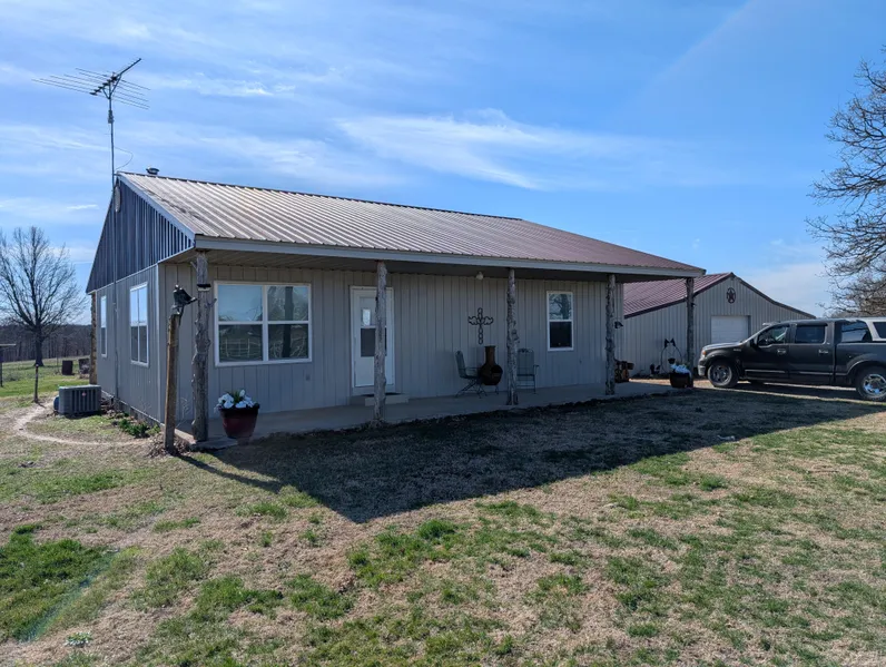 Discover your ideal country retreat on this 43-acre property with convenient highway frontage and gorgeous pond. The durable metal sided home features a metal roof, an open-concept living area combining the living room, dining area, and kitchen, plus a primary bedroom with en-suite bath, a second bedroom, another full bath, and a utility room with washer/dryer hookups.Outside, you'll find a spacious 32x40 detached garage, a sturdy pipe corral, and multiple outbuildings for storage and versatile use. With ample space and easy access, this property is perfect for agriculture, livestock, or a peaceful country lifestyle. Don't miss this exceptional opportunity!