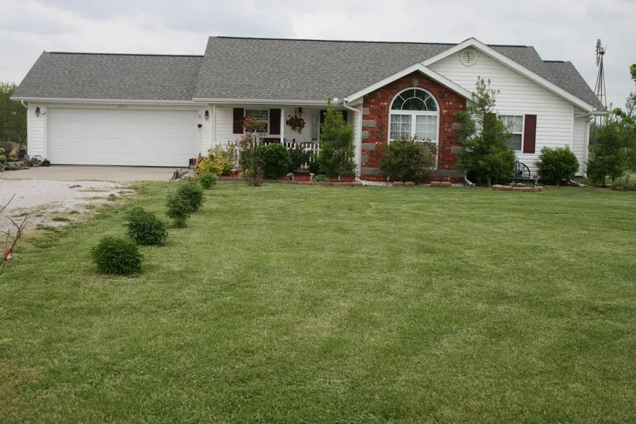This lovely home has been beautifully maintained with gorgeous landscaping, vinyl windows and siding, and a patio with vinyl privacy fencing. Upon entering the covered front porch tile flooring graces your feet. The kitchen includes a tray ceiling, custom oak cabinetry and black/stainless steel appliances - plus a raised bar and pantry. Nice open living room and down the hall you will find two bedrooms, a bathroom, and utility room. The master suite is huge with a tray ceiling trimmed in oak hardwood moldings and a nice 6'x6' walk-in closet. The master bath includes more custom oak cabinetry, double lavatories, tiled flooring, and an enormous walk-in tiled shower. All this on 2 acres and includes 2 storage buildings for extra storage. 1 - 10'x8' and 1 - 10'x16'