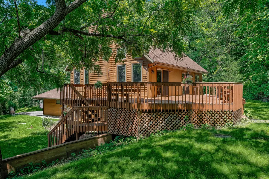 Enjoy the beautiful westerly views, sunsets and the Mississippi River from this cedar sided A-Frame built in 1990; nestled in the tree's just 10 minutes from south La Crosse. 1.5-acre private lot and large deck. Finished basement with 4th bdrm or den, large family rm w/fireplace -utility rm-bath. Main floor has an open concept living-kitchen-dining, vaulted ceiling with fireplace, 2 bdrms and full bath. Upper loft has a master suite and additional den/office space. Cedar siding was re-painted in 2024. With a little TLC, this home will shine and will make a beautiful place to call home for many years to come!