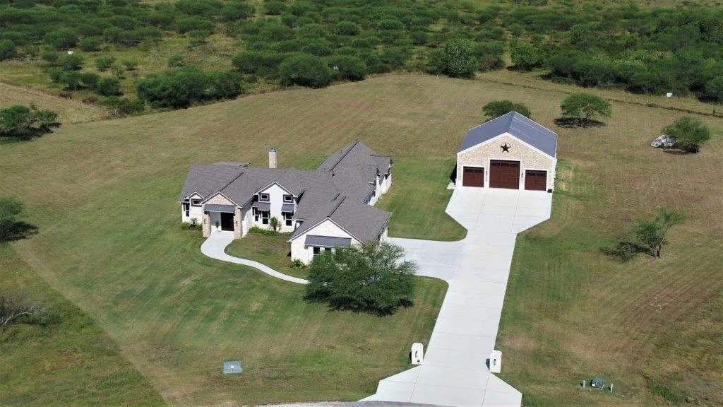 Luxurious entertainer's dream home; no expense spared! 4 bd/3.5 ba w/guest master on 4 ac. Open concept, 22 ft cathedral ceilings w/22ft quartz faced fireplace, custom trim & crown molding throughout. Modern plank flooring, all natural quartz, travertine & granite surfaces. Thermador commercial appliances, large column fridge/freezer, double ovens, 6 burner cooktop, griddle/grill, 2 warming drawers, microwave & 2 dishwashers. Bar w/wine fridge & keg dispenser, 700 bottle wine cellar at constant 55 degrees. Walk-in pantry/7x18 storage closet. 900 sq ft "Master Retreat" 16 ft beamed ceiling, 2nd fireplace at 16 ft, "his and hers" vanities & walk-in closets, extra wide soaker tub for 2, walk-through shower, 3 rain shower heads. Hidden walk-in vault for your treasures & monitored alarm system. Covered patio, outdoor fireplace & kitchen: Coyote commercial appliances, gas grill & burner. 2.5 car attached garage & 60x40 shop, 14 ft door, RV hookups inside & out, wash sink & room for 6 vehicles. Custom built by Victoria's prestigious Blanton Homes w/all high end features. Country subdivision; 10 min. from West High School/Cade Middle School & shopping. Sprinkler system in front yard, finished out garage, insulated doors. One bath has outdoor access for future pool & outdoor shower. 3 HVAC zoned units; 1 dedicated to wine room to maintain constant temp. Collector's/Hunter's dream with great room's walls "cladded" in 3/4" plywood, no need to find studs to hang artwork/trophies. Hidden, climate controlled 10x13.5 vault, with custom gun racks & storage will be revealed to serious buyer. Perfect for storm shelter too. Kitchen is chef's dream, custom twin spice racks concealed on side of commercial 6-burner stove. Water in master shower changes color with temperature change. 3 fireplaces w/propane starter, only outdoor fireplace wood burning. 2 Tankless water heaters, "Hydrogen Peroxide Drip" water softener. African wall sconce excluded.