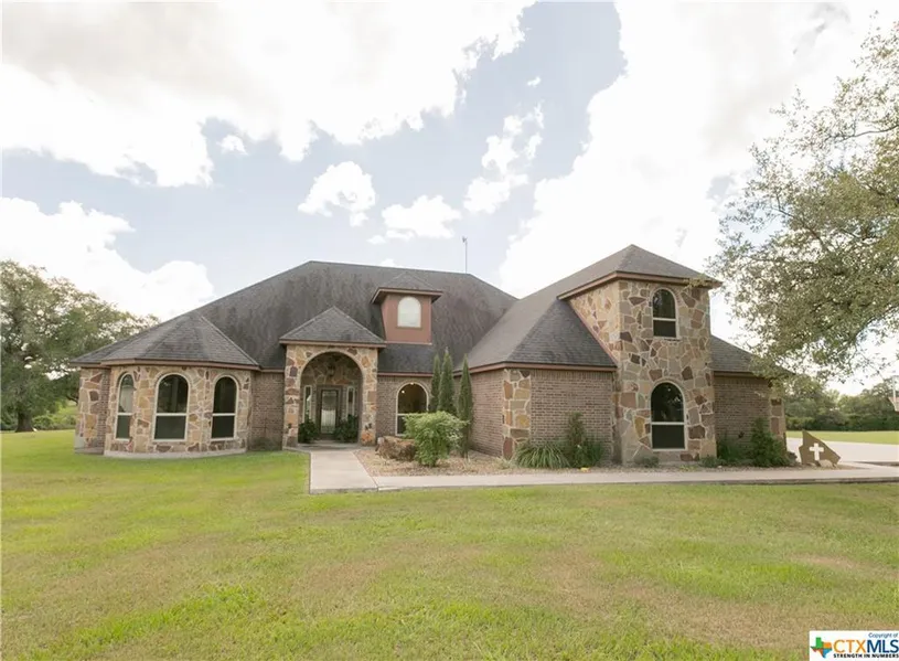 Start writing your new family story in an up-dated version of a home fit for the "Brady Bunch", with 5 bedrooms, on the main level, plus an upstairs loft that could be sleeping/guest quarters. Only 7 min drive to Inez Elementary and located in Industrial ISD. Enjoy quiet time in front of the fireplace in the great room open into the kitchen, 2 dining areas and overloooking a 2 ac yard with creek frontage. Play games in upstairs kids retreat, with 3 game consoles/ 3- 55" TV's and a luxurious media room. (TV's, Surround sound equipment & furnishings can be purchased separately). 2013 Custom home; approx 4,200 sq ft, 3.5 baths, mudroom, utility room, all walk-in closets. On-demand HWH, 5 burner cooktop, built-in hutch, custom cabinets and one bdrm that could be mother-in-law suite. Elegant master bath with ensuite, soaking tub and tile shower. 30'X50' workshop with half bath & room to store RV, with sewer clean-out and 50 amp plug on inside & out. Some furnishings could stay.