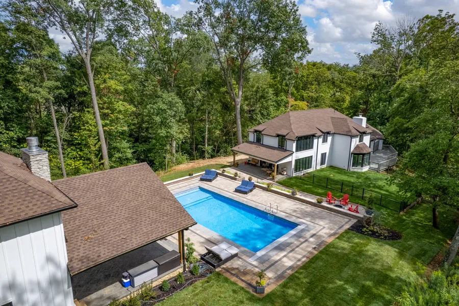 A rare find located right on the 7th tee box of the Country Club of Terre Haute golf course; you'll see a lot of imagination has gone into the transformation of 605 Putter Point Ct! A lthough it's easy access by golf cart to the course and club, you'll love the privacy as its tucked away and secluded by trees. The sellers have expanded the main home with a large addition designed for effortless entertaining. A covered porch flows seamlessly into spacious dining and living areas at one end of the home, adjacent to the pool, creating an ideal space for gatherings. The home maintains its original charm with beautifully updated fireplace while be refreshed with modern and inviting colors. In the eat-in kitchen warm hues create a cozy yet sophisticated atmosphere. Practical features like a main level laundry and mudroom conveniently situated off the garage make daily living a breeze! Ascending the grand staircase, you'll find 3 bedrooms on the 2nd level. The enormous master suite is a true highlight, with a massive walk in closet and luxurious ensuite bathroom with stone walk in shower, perfectly capping off the elegance of this exceptional home! The pool house features a spacious grand porch complete with a well-appointed outdoor kitchen, perfect for entertaining. Inside the pool house you're welcomed by a soaring 2 story ceiling in the living area, which includes a cozy kitchenette. The space also offers a full bathroom, comfortable lofted bedroom, and finished basement. Additionally, the pool house included a garage specifically designed to park a golf cart, combining luxury with convenience.