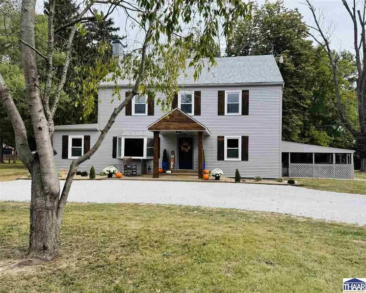 This meticulously renovated two-story residence seamlessly integrates modern farmhouse elements with its original charm, yielding a captivating and inviting atmosphere. The property's curb appeal is significantly enhanced by a spacious pebblestone covered porch, new roof, new windows, and custom board and batten shutters. Key features include an expansive open-concept living/dining room, complete with a fireplace and luxury vinyl plank flooring, which flows seamlessly into the den/office through french doors. The kitchen boasts butcher-block countertops, deep blue shaker cabinets with soft-close doors and drawers, a farmhouse-style sink, pantry, and stainless steel appliances. The main level is completed by a laundry room and a full bath. Four bedrooms and a full bath are located upstairs, while the freshly painted gray interior maintains the farmhouse charm. A partial basement provides additional space for added living areas. The tranquil two-acre property features a concrete area with a fire pit and seating, as well as a covered seating area alongside the residence. There is nothing left to do except move in!