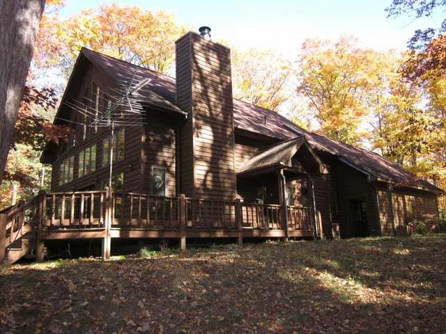 The Lakeside of the home has a wall of windows three stories high, to enjoy the tranquil beauty presented before you. A great room designed 1st floor with a Living Rm containing a massive Stone Fireplace that stretches to the top of the Cathedral Ceiling. Knotty pine walls for that perfect "Northwoods" touch. Lakeside Dining Rm accommodates everyone. The "Northwoods" Kitchen has Snack Bar seating & all appliances included. A Loft sitting area also enjoys the Lakeside views. 2 Bed/1 Bath in the Loft Area & 2 Bed/1 Bath on the 1st flr. A 1st Flr Laundry Rm, Wrap around Deck, 2 Car insulated, att. Garage + 2 Car Det Garage for all the "Toys".