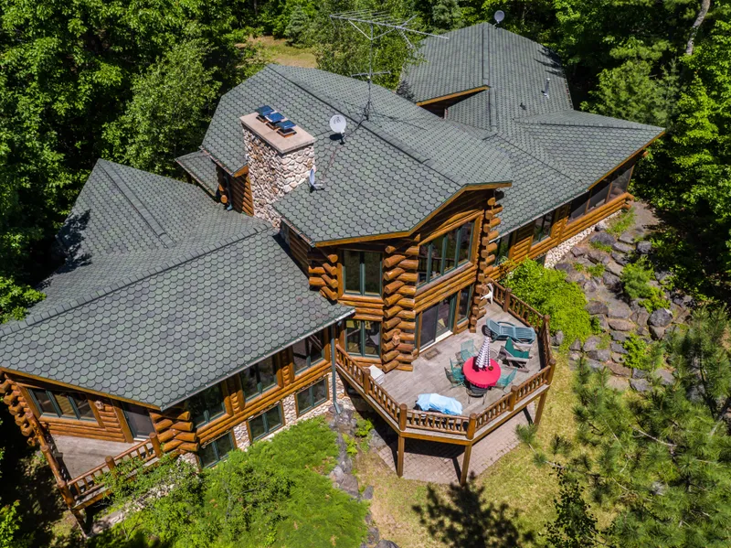Custom designed full log home on 1052 acres of crystal clear water, with 136' of sand frontage, and great privacy, on the Fence Lake Chain. The main floor offers an exceptional great room with soaring ceilings, a wall of glass, a floor to ceiling stone fireplace, a spacious kitchen with Corian surfaces and a center island, and a lakeside dining area. There is a 2-car attached garage which enters into main floor laundry/mud room. The lakeside master bedroom suite has a stone fireplace, a private deck, walk-in closet and a master bath with slate shower and whirlpool tub. Enjoy outdoor dining on the sun deck with beautiful lake views, or a movie in the media room. Upper level sleeping loft/office,is every childs dream. The walk-out lower level, includes a huge family room with stone fireplace, wet bar, sauna, two large bedrooms, and a full bath. Swimming, excellent fishing, and great boatin...