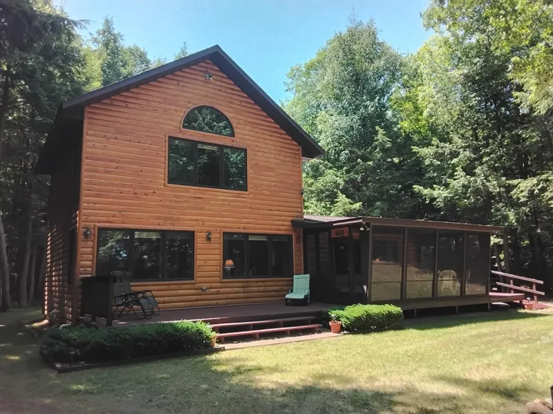 ELSIE LAKE CABIN - Sitting amongst majestic towering pines, you'll find this very Northwoodsy 2 BR, 3 BA year-round log sided cabin. There's no work to be done and the seller is leaving nearly everything (furniture/decor/outdoor/garage items), so just bring your toothbrush and start enjoying lake life! Featuring granite counters, Hickory cabinets and flooring, main floor laundry, a quaint bunk for added sleeping space, HUGE master suite with vaulted ceiling and private BA, 3-season porch, lakeside deck, unfinished partial basement, and a 2 1/2 car detached garage. The 1.24-acre level lot is nicely wooded with just a few steps leading down to 175' of sand frontage. Elsie Lake is a premium crystal clear 46-acre electric motor only lake perfect for swimming, fishing, kayaking, and canoeing. Small lakes don't get any better than this one! Very quiet and tranquil area, yet only 15 minutes to ...