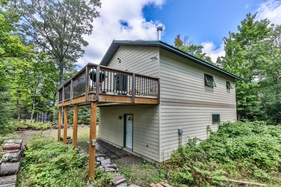 This property offers 206 ft of Frontage on Wildcat lake in Presque Isle which is about 350 acres. The living quarters over the garage is 768 sq ft with one bedroom and one full bath, living rm area, kitchen with appliances, lower mud room has washer and dryer. Seller has put in a 1500 gallon septic for future growth of main home. Drilled well is 60 ft deep. Seller just replace wooden deck which is 24x12. Home has a Metal roof, and composite siding. This property faces west, great public hunting land on east side of the road. Near snow mobile trails, and UTV Trails, 6 minutes out of Boulder Junction. Welcome Home!
