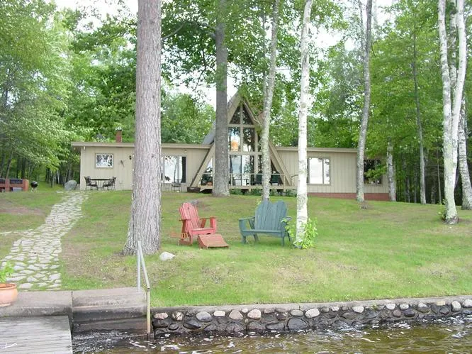 One of the most outstanding locations on this beautiful Manitowish 10 lake chain clean, clear lakes. Deep lot offers fieldstone seawall across front and into the private lagoon to wet boathouse with carpeted sitting deck above. Outside amenities include a tennis court, brick B-B-Q, paver firepit area and newly remodeled,2 BEDROOM, 1 BATH 4 SEASON GUEST HOUSE by the tennis court. The home is an A-Frame with wings on both side. Kitchen has been professionally remodeled by Dream Kitchens of Madison, new windows lakeside in kitchen, dining and living room, new doors,fireplace refaced with cultured fieldstone and new roof, generator and air conditioning. The one wing has the kitchen, dining, bath with shower and 2 bedrooms. The other wing has 1/2 bath, master bedroom suite with sitting room/den and large bath with step-down ceramic tiled shower. Detached 2+ car garage with wood storage ...