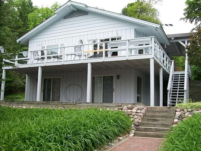 Beautiful, immaculate 4 season home. Wood-gated entrance property with large driveway. Main level: open living (with split fieldstone masonry fireplace), dining, and kitchen; bath; beautiful distressed Oak flooring with swedish finish; master bedroom with raised fieldstone masonry fireplace, walk-in closet, and master bathroom with double sink vanity, shower stall, and large Jacuzzi tub. Lower level walkout: family room with fieldstone masonry fireplace and cabinets, 2 bedrooms, full bathroom with double sinks, and laundry/utility room. Wood paneling throughout, air conditioning, electric heat, and an automatic generator. Back property has wood storage sheds and room for storage of boats, snowmobiles, etc. Property beautifully landscaped and well cared for. All the windows are Pella thermopane and casement. Double door entry protected by a covered porch and opens to a wrap around deck th...