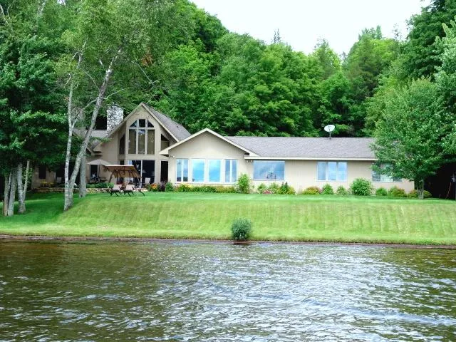 This 4BR/4BA home on Fence Lake offers the very finest of gracious, Northwoods living! Nestled on 6+ wooded acres, the home sets close to the water w/200' of ripple sand shoreline. The Foyer w/maple floors leads to the spacious and elegant LR with massive stone fireplace, wall of lakeside windows, vaulted T&G ceiling, wet bar & doors to outside patio w/magnificent lake views. The designer kitchen has center island, granite countertops, stainless steel appliances and gorgeous custom cabinets w/adjoining DR. The 4-season room w/walls of windows & tile floors offers the perfect place to relax and enjoy views of the lake. The Master Bedroom suite is spacious & refined w/vaulted ceilings, walk-in closet, & Master Bath w/soaking tub and walk-in shower. There are 2 addnl bedrooms, 2 baths and laundry room on the main level. Above the heated 2-car garage is a guest suite w/bedroom, sitting area ...