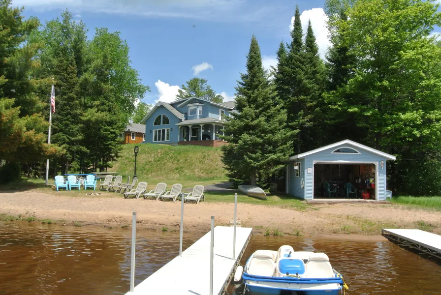 Rare Plum Lake property w/504' sugar sand beach, 5 acres & west exposure! Custom home built to take full advantage of stunning lake views including the most amazing sunsets! Remarkable stained glass is tastefully built into several areas of the home. Spacious 3BR, 3BA is perfect for entertaining & includes tons of living space. LR w/vaulted wood ceiling & lakeside french doors. Great Room w/vaulted ceiling is open to sunroom w/beautiful lakeside windows & door that leads to the wrap around covered deck. Eat-in kitchen has tasteful cabinetry & center island w/cooktop. BR & full bath also on main floor. Entire 2nd level is the MBR suite w/private bath & gorgeous lake views from the large bay window & private balcony. In the LL & a must see is the dramatic wood bar, back bar & copper ceiling which commands your attention & takes you back to another era in time! 3rd BR, bath, laundry & office also on LL. Includes dry boat house at the beachfront, lakeside gazebo, 2 garages & 2 sheds.