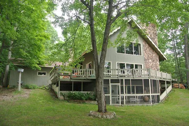 Chalet style home on picturesque Towanda Lake offers 153' of level frtg with western exposure. Spacious and quality built home offers seclusion on a full recreation lake, yet close to town. The level landscaped yard provides a large area to enjoy cookouts, yard games and all day sun. End the evenings w/ a fire by the lake or watch the sunset from the large lakeside deck or screened in lower level deck. Custom 1.5 story home has three levels of living area. Upper level is the master suite, featuring a large bdrm, full bath & generous walk in closet. Beamed cathedral ceiling in great room is enhanced by a two story California stone wood burning fireplace. Open floor plan ties in the dining & kitchen area & a wall of windows affords wonderful lake views. Lower level has been newly finished w/kitchen area, hobby room & brick wood burning fireplace. New windows '13, new roof '11, main floor bathroom '15 (tile, granite, tub & walk in shower). Excellent primary residence or N'Woods retreat!